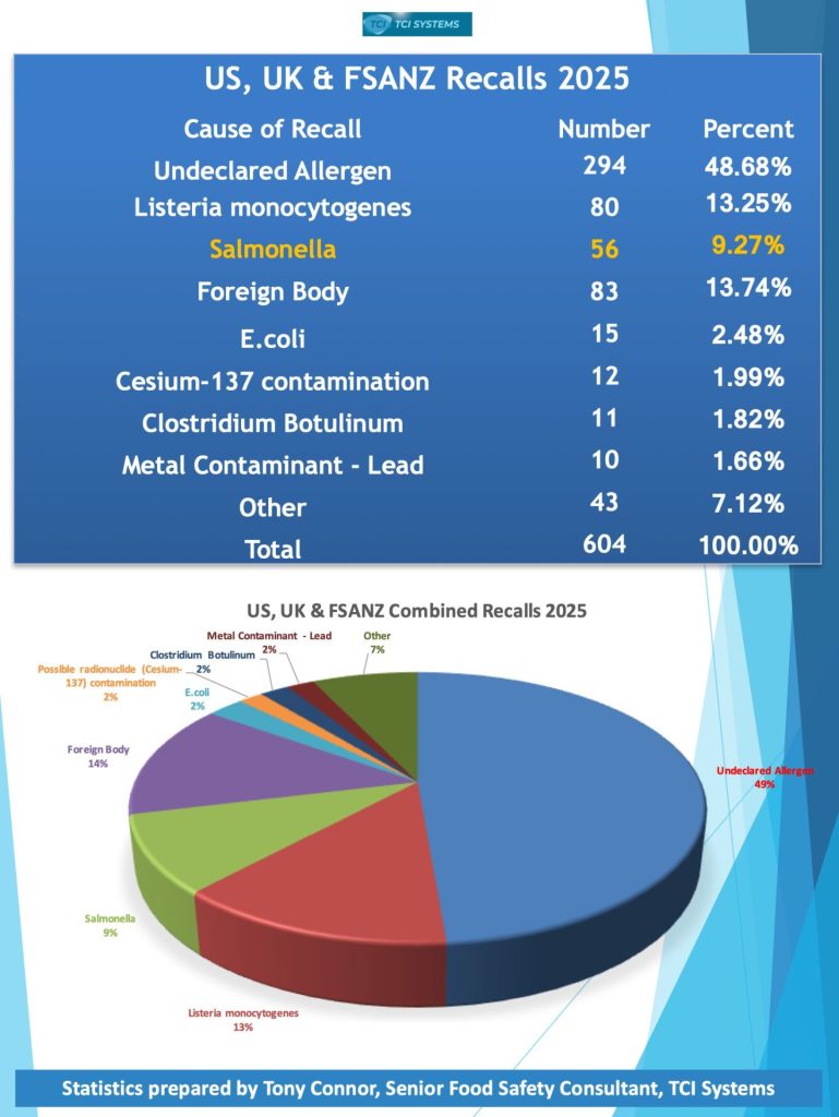 At the start of this year I analyzed Major Food Safety Product Recall statistics from 2025 for the United States (FSIS & FDA), Canada, United Kingdom, Australia and New Zealand. My analysis found familiar reasons for the recalls, from a total of 872 recalls 42.66% were due to Undeclared Allergen 19.61% were due to Salmonella Contamination and 10.55% due to Listeria monocytogenes Contamination.